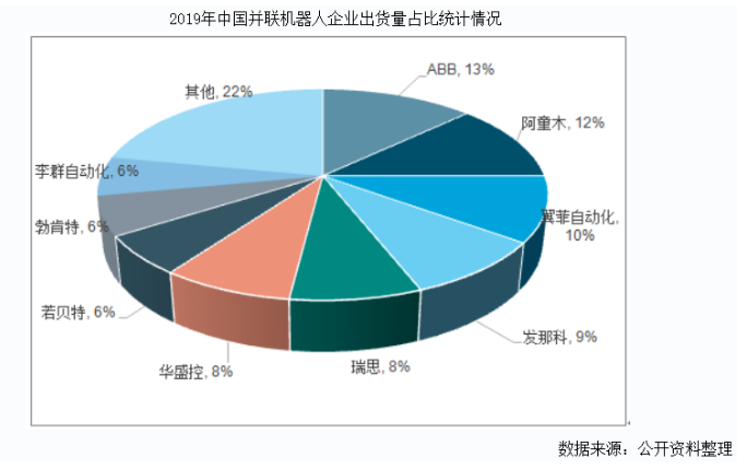 根據(jù)中國(guó)產(chǎn)業(yè)研究報(bào)告對(duì)于并聯(lián)機(jī)器人的調(diào)研分析,數(shù)據(jù)顯示,2019年,我國(guó)并聯(lián)機(jī)器人出貨量排名前九的企業(yè)分別是ABB、阿童木、翼菲自動(dòng)化、發(fā)那科、瑞思、華盛控、若貝特、勃肯特、李群自動(dòng)化等。