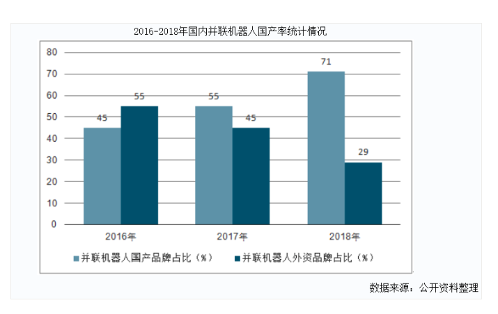 隨著競(jìng)爭(zhēng)實(shí)力不斷提升,國(guó)產(chǎn)并聯(lián)機(jī)器人市場(chǎng)份額持續(xù)攀升,2017年市場(chǎng)占有率已經(jīng)達(dá)到55%,首次超越外資品牌成為市場(chǎng)主導(dǎo)者。2019年國(guó)產(chǎn)市場(chǎng)占有率進(jìn)一步提升至71%,可以說(shuō),國(guó)產(chǎn)廠商已逐步占據(jù)一定的市場(chǎng)主動(dòng)權(quán)