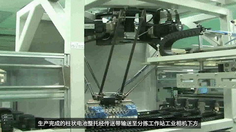 生產(chǎn)完成的柱狀電池整托經(jīng)傳送帶輸送至分揀工作站工業(yè)相機(jī)下方,通過(guò)視覺(jué)系統(tǒng)定位、識(shí)別、檢測(cè),并由機(jī)械手定點(diǎn)跟蹤、抓取,將不同電池放至對(duì)應(yīng)工位并由螺旋輸送機(jī)輸出,進(jìn)入人工裝盒環(huán)節(jié),自動(dòng)化工序完成。